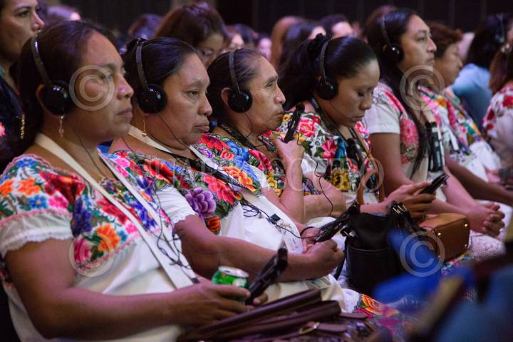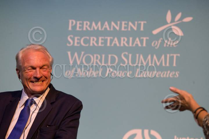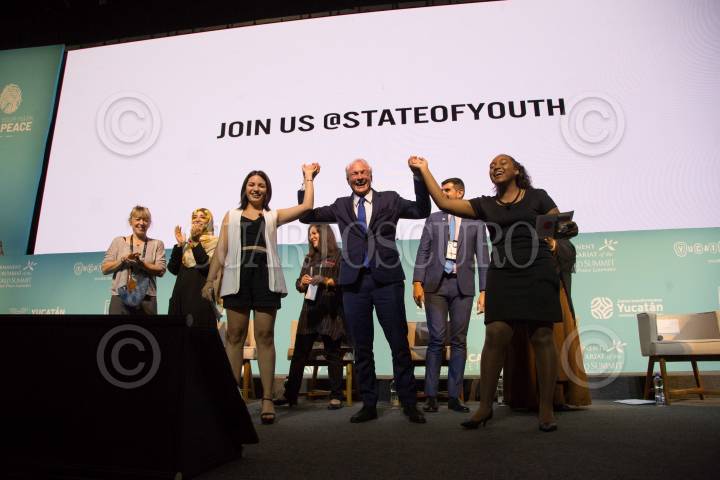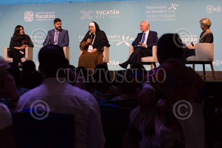 MÉRIDA, YUCATÁN, 20SEPTIEMBRE2019.- Los Laureados Taawakkol Karman, Jody Williams acompañados de los representantes de agrupaciones sociales participantes en la cumbre, Daniel Solana, Mother Agnes Marie Of the Cross, Mark Dulaert y Erika Guevara participaron en la plenaria "La Responsabilidad de los Medios Globales en la preservación de la Paz ", como parte de las actividades realizadas en el marco de la Cumbre Mundial de los Premios Nobel de la Paz celebrada en la entidad . FOTO: MARTÍN ZETINA /CUARTOSCURO.COM