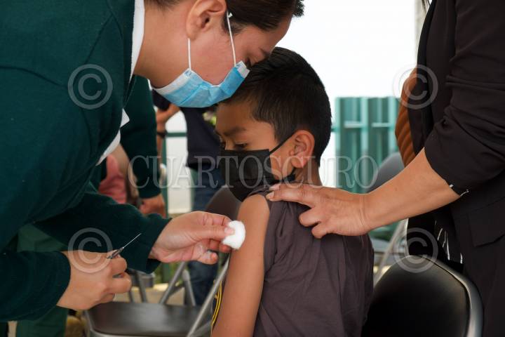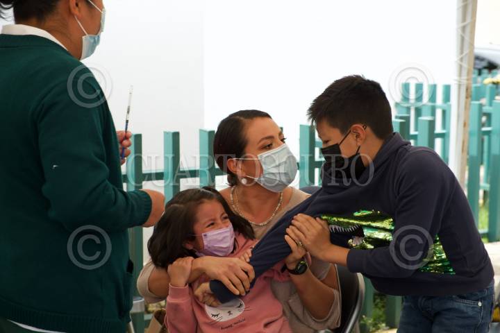 Dos niños acompañados de su mamá fueron vacunados contra el Covid- 19 en la Unidad de Medicina Familia 17 del IMSS en San Cristóbal de las Casas