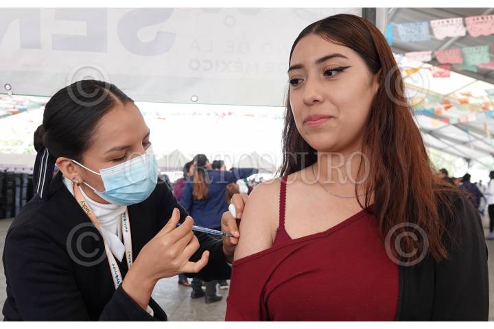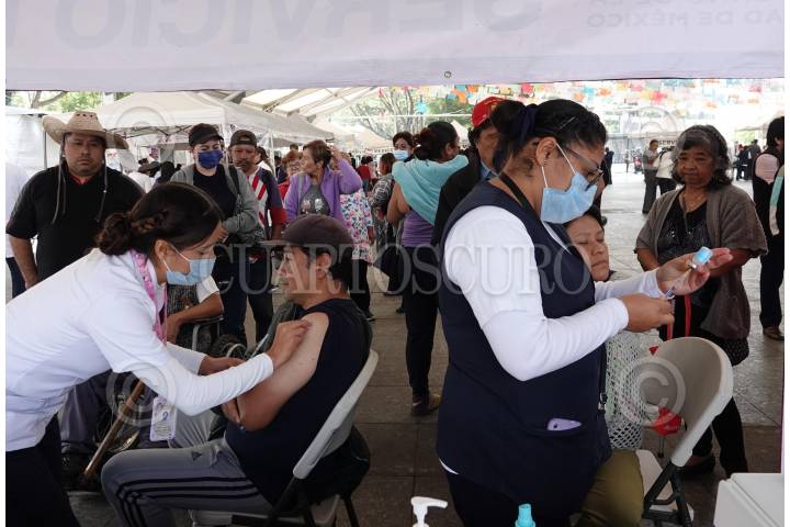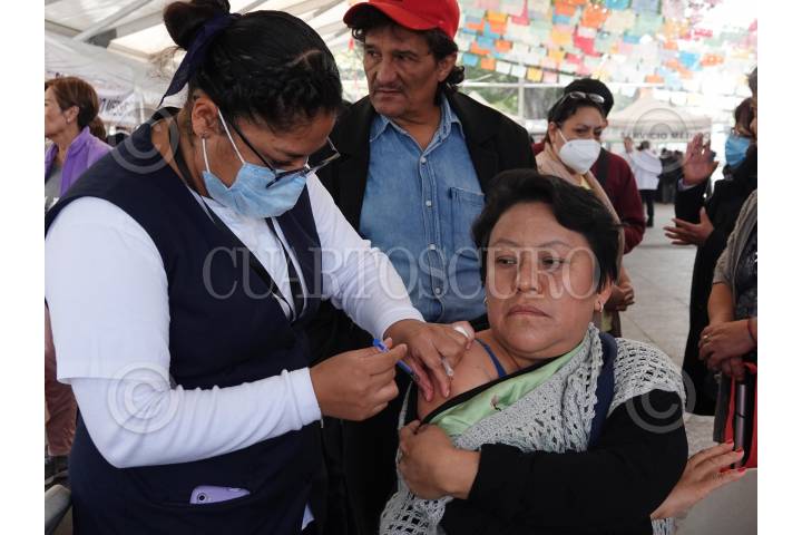 CIUDAD DE MÉXICO, 17OCTUBRE2023.- Personal médico aplicó la vacuna de refuerzo contra la Influenza y Covid-19 a mujeres durante la jornada de vacunación en la explanada de la alcaldía Iztapalapa. FOTO: GRACIELA LÓPEZ /CUARTOSCURO.COM