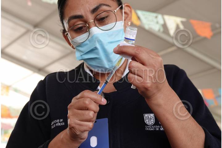 CIUDAD DE MÉXICO, 17OCTUBRE2023.- Personal médico preparó la vacuna de refuerzo contra la Influenza y Covid-19 para su aplicación durante la jornada de vacunación en la explanada de la alcaldía Iztapalapa. FOTO: GRACIELA LÓPEZ /CUARTOSCURO.COM