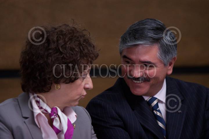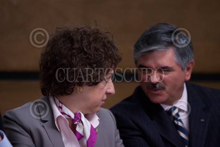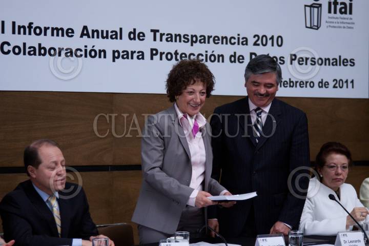 MÉXICO, D.F., 21FEBRERO2011.- Jacqueline Peschard comisionada presidenta del IFAI y Leonardo Valdés consejero presidente del IFE durante la firma de colaboración entre el IFAI y el IFE en materia de datos personales y la entrega del Informe Anual de Transparencia y Acceso a la Información 2010 del IFE. FOTO: IVAN STEPHENS/CUARTOSCURO.COM