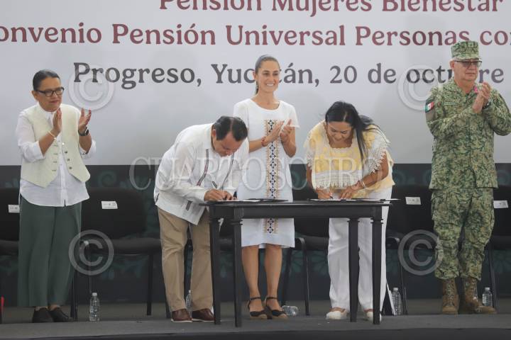 PROGRESO, YUCATÁN, 20OCTUBRE2024.- Claudia Sheinbaum Pardo, Presidenta de México, encabezó la entrega de Pensiones Mujeres Bienestar y firmó el convenio de la Pensión Universal para Personas con Discapacidad, en la Unidad Deportiva Progreso. En la imagen la acompañan Raymundo Pedro Morales Ángeles, Rosa Icela Rodríguez, Joaquín "Huacho" Díaz, Ariadna Montiel, Ricardo Trevilla, y Jesús Esteva Medina. FOTO: MARTÍN ZETINA/CUARTOSCURO.COM