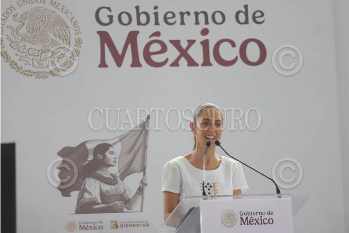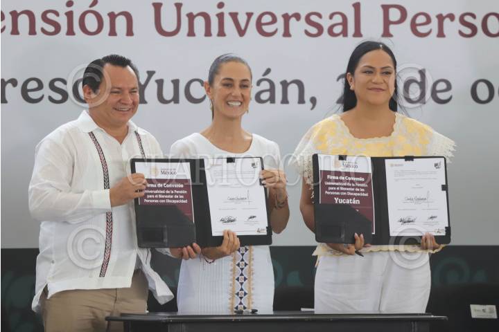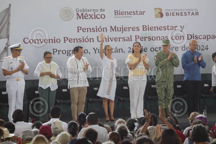 PROGRESO, YUCATÁN, 20OCTUBRE2024.- Claudia Sheinbaum Pardo, Presidenta de México, encabezó la entrega de Pensiones Mujeres Bienestar y firmó el convenio de la Pensión Universal para Personas con Discapacidad, en la Unidad Deportiva Progreso. FOTO: MARTÍN ZETINA/CUARTOSCURO.COM