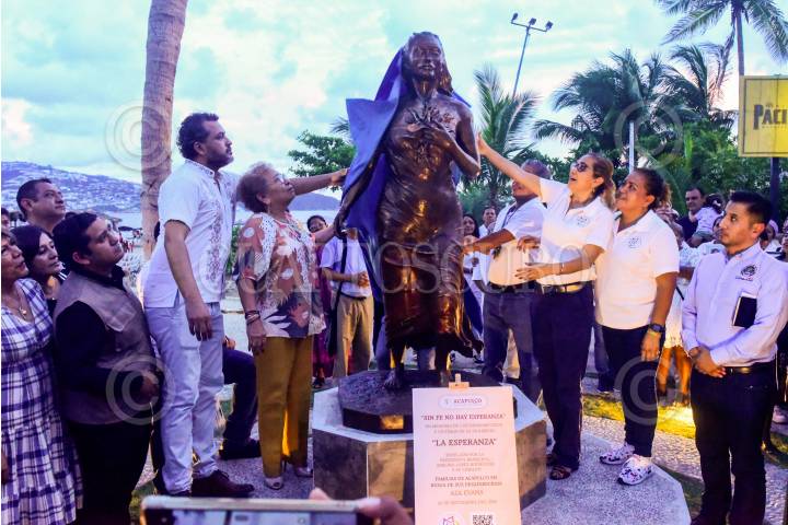 ACAPULCO, GUERRERO, 20SEPTIEMBRE2024.- Integrantes de diferentes colectivos de familiares en busca de desaparecidos en Acapulco, develaron el antimonumento a los desaparecidos llamado "La Esperanza" en la avenida Costera frente a la playa Tamarindos. La encargada de realizar la obra fue la escultura Aza Evans. FOTO: CARLOS ALBERTO CARBAJAL/CUARTOSCURO.COM