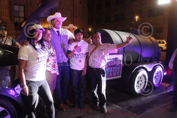 Adrián Esper Cárdenas, candidato a gobernador por el PES de San Luis Potosí, presentó unos vehículos eléctrico TESLA, según él estas unidades servirán para arrastrar pipas de agua y solucionar el problema de desabasto de agua en 58 municipios en el estado.