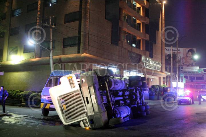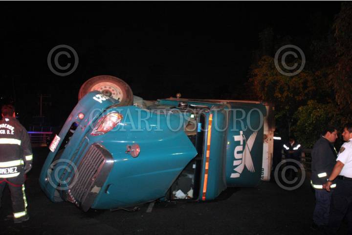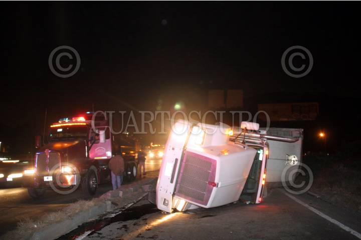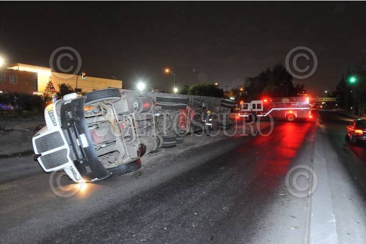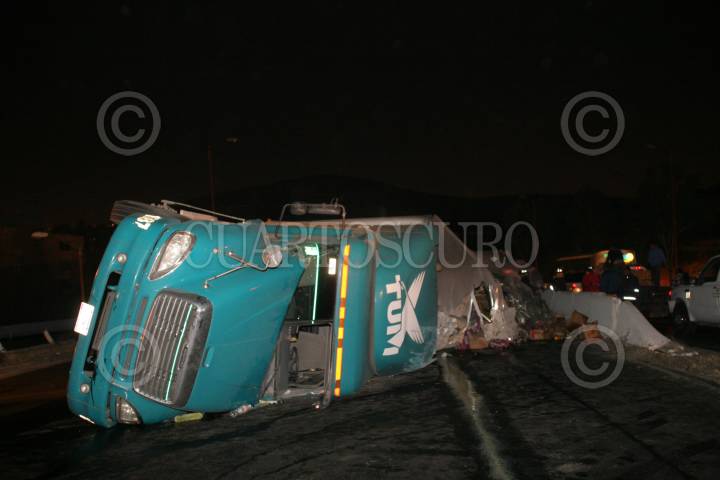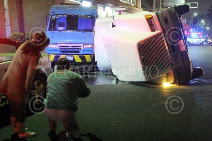MÉXICO, D.F., 17MARZO2010.- Esta madrugada se registró la volcadura de un trailer con 20 toneladas de equipo para jardinería en los carriles laterales de Zaragoza a la altura de la colonia Juan Escutia en Iztapalapa, cabe mencionar que dicho paso se encuentra en pésimas condiciones. FOTO: LUZ ACEVEDO/CUARTOSCURO.COM
