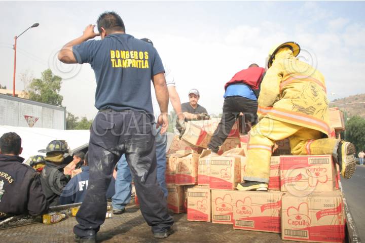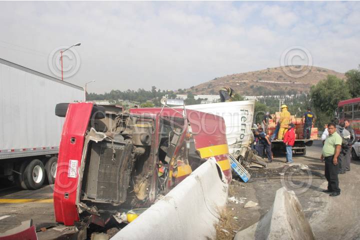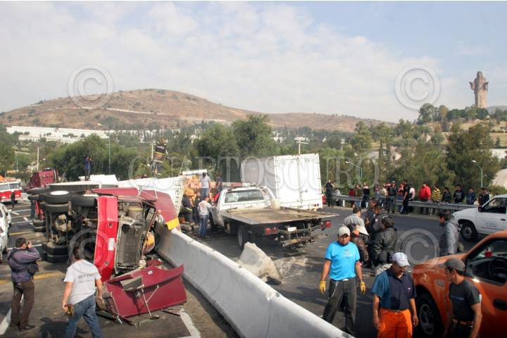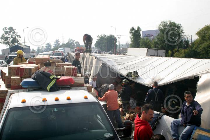 TLALNEPANTLA, ESTADO DE MÉXICO, 28DICIEMBRE2009.- Esta madrugada se registro una volcadura de dos trailers, desquiciaron el tránsito vehicular sobre la autopista México-Querétaro por mas de seis horas. Uno de los pesados vehículos volcó sobre la autopista en su incorporación hacia la avenida del Durazno, el vehículo de carga transportaba 18 toneladas de huevo. El otro vehículo recostó sobre su lado izquierdo sobre la avenida Jesús Reyes Heroles frente al panteón Jardínes del Recuerdo con mas de 30 toneladas de botellas de tequila. FOTO: LUZ ACEVEDO/CUARTOSCURO.COM