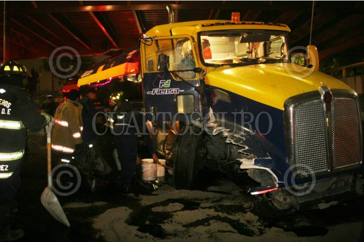 MÉXICO, D.F., 18FEBRERO2010.- Un trailer con doble contenedor se estrelló en el muro de contención de calzada de Tlalpan y Taxqueña, reventándose los tanques de diesel, provocando el cierre de las laterales con dirección al Centro por más de cuatro horas. FOTO: LUZ ACEVDO/CUARTOSCURO.COM