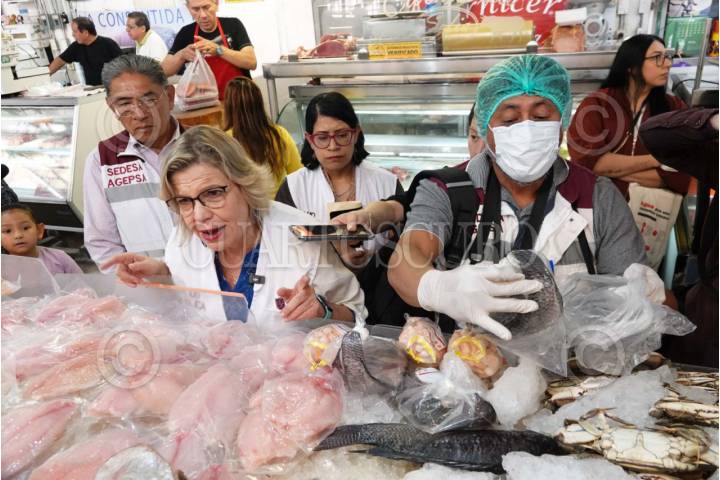 CIUDAD DE MÉXICO, 16ABRIL2025.- En en el marco de Cuaresma, Nadine Gasman, secretaria de Salud, encabezó un operativo de Vigilancia Sanitaria en el Mercado Hidalgo. FOTO: GRACIELA LÓPEZ/CUARTOSCURO.COM