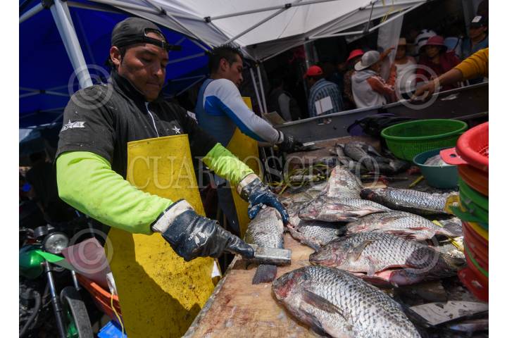 Venta de pescado en San Luis Mextepec en el municipio de Zinacantepec, la gente que busca consumir pescado durante Semana Santa acude a este lugar en donde puede encontrar productos frescos.