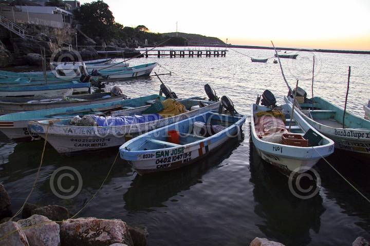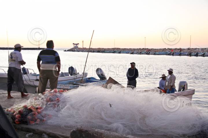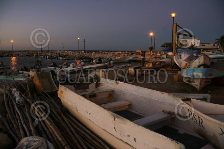 LERMA, CAMPECHE, 23ENERO2009.- Amanecer en el embarcadero y puerto pesquero municipal "Kila". Aquí todas las embarcaciones permanecen sin realizar alguna actividad y están sumados al paro general de Cero Pesca, sin embargo algunos de los pescadores ribereños permanecen en vigilancia y atentos a cualquier llamado. FOTO: MARCO POLO GUZMÁN HERNÁNDEZ/CUARTOSCURO.COM