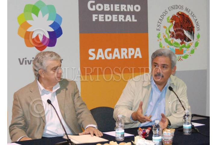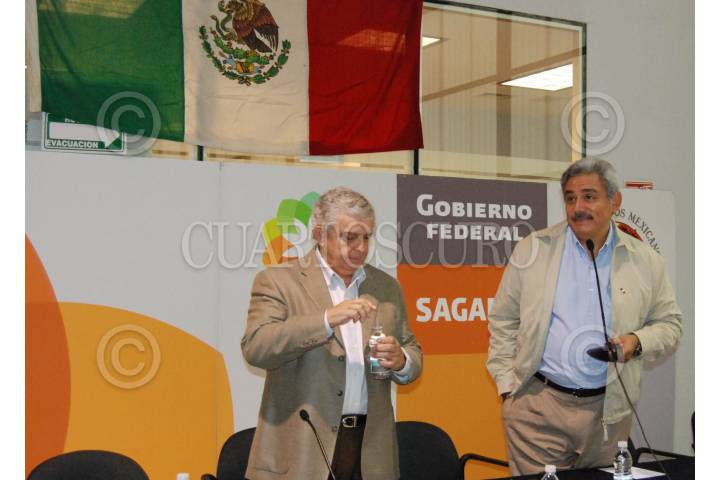 MÉXICO D.F., 30ENERO2009.- Ramón Corral, comisionado de Pesca y Acuacultura y Alberto Cardenas, titular de la SAGARPA explicaron que el dia de hoy tenian previsto realizar una firma de convenio con la Cámara Nacional de la Industria Pesquera y Acuícola (Canaipesca), pero que no se llevo acabo debido a que el presidente de la (Canaipesca) no asistio al lugar, pero que en la brevedad se firmaria dicho convenio. FOTO: SAÚL LÓPEZ/CUARTOSCURO.COM