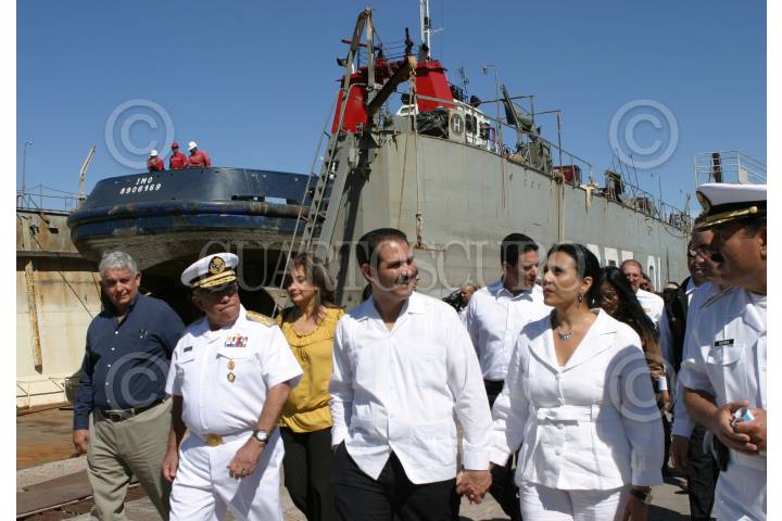 GUAYMAS, SONORA 29OCTUBRE2009.- María Iveth Dagnino Acuña de Padrés y Guillermo Padrés, gobernador del Estado, durante la botadura del buque de investigación pesquera construído por la Secretaría de marina en coordinación con la SAGARPA y CONAPESCA. FOTO: IVAN STEPHENS/CUARTOSCURO.COM