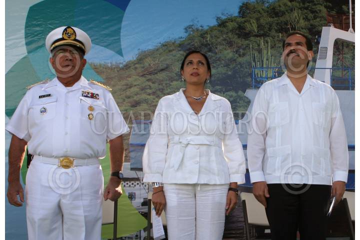 GUAYMAS, SONORA 29OCTUBRE2009.- Francisco Saynez Mendoza, Secretario de Marina Armada de México; María Iveth Dagnino Acuña de Padrés y Guillermo Padrés, gobernador del Estado, durante la botadura del buque de invesstigación pesquera construído por la Secretaría de marina en coordinación con la SAGARPA y CONAPESCA. FOTO: IVÁN STEPHENS/CUARTOSCURO.COM