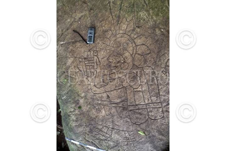 MUNICIPIO DE ÁLAMO-TEMAPACHE, 17ABRIL2013.- Arqueólogos del Instituto Nacional de Antropología e Historia (INAH) registran e investigan un conjunto de petrograbados localizados en las faldas del Cerro del Sombrerete, en el municipio de Álamo-Temapache, al norte del estado de Veracruz, entre los que destaca la representación de un sacerdote u “hombre sabio”, cuyo simbolismo y estilo iconográfico vinculado con la cuenta del tiempo, al parecer no se había registrado en la región Huasteca. Dicha manifestación gráfica inscrita en una gran placa de roca sedimentaria de 2.90 por 2.50 m, que podría alcanzar los 500 años de antigüedad, fue descubierta a mediados de enero pasado por unos campesinos dedicados al corte de cítricos en el área. De acuerdo con María Eugenia Maldonado Vite, arqueóloga responsable del registro, estas expresiones culturales posiblemente están relacionadas con el conteo del tiempo, el movimiento de los astros o el culto a los cerros. A pesar de no contar con datos suficientes es muy probable que los diseños hayan sido hechos por antiguos grupos huastecos. FOTO: INAH /MARIA EUGENIA MALDONADO /CUARTOSCURO.COM
