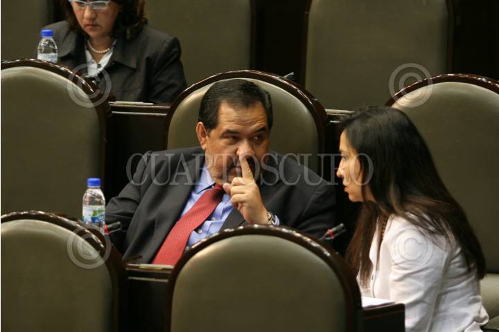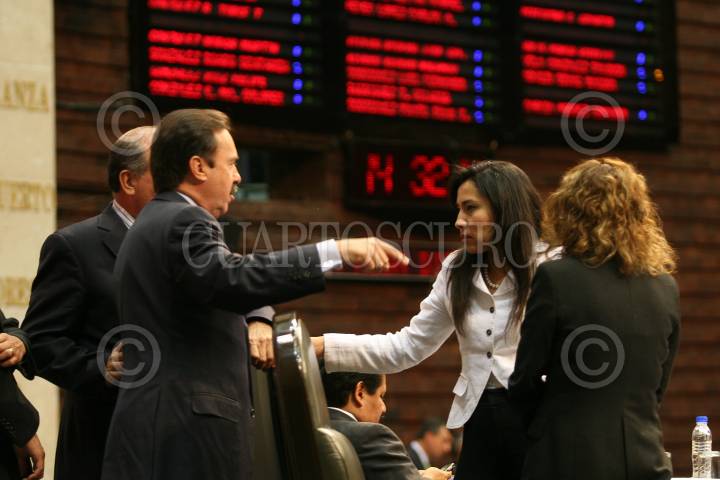 MÉXICO D.F. 25MARZO2008.-Sesión ordinaria en la Cámara de Diputados donde se realizaba el posicionamiento en relación al día de la expropiación petrolera.En la imagen los diputados Hector Larios (PAN) y Ruth Zavaleta (PRD) dialogan durante la sesión. FOTO: GUILLERMO PEREA/CUARTOSCURO.COM