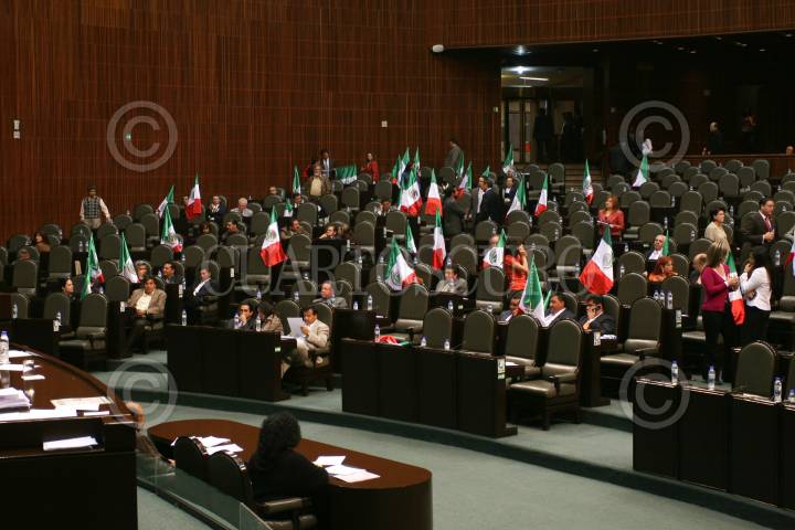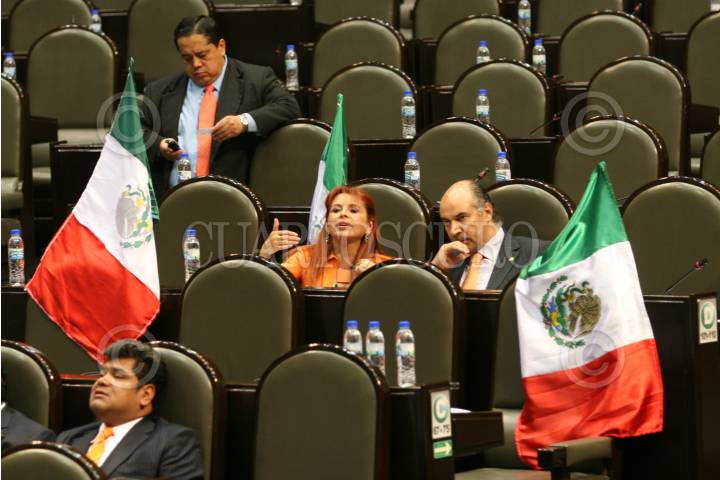 MÉXICO D.F. 25MARZO2008.-Diputados de la izquierda colocaron banderas en sus curules, durante la sesión donde se realizaba el posicionamiento en relación al día de la expropiación petrolera.En la imagen los diputados Laida Sansores y Alejandro Chanona (Convergencia). FOTO: GUILLERMO PEREA/CUARTOSCURO.COM