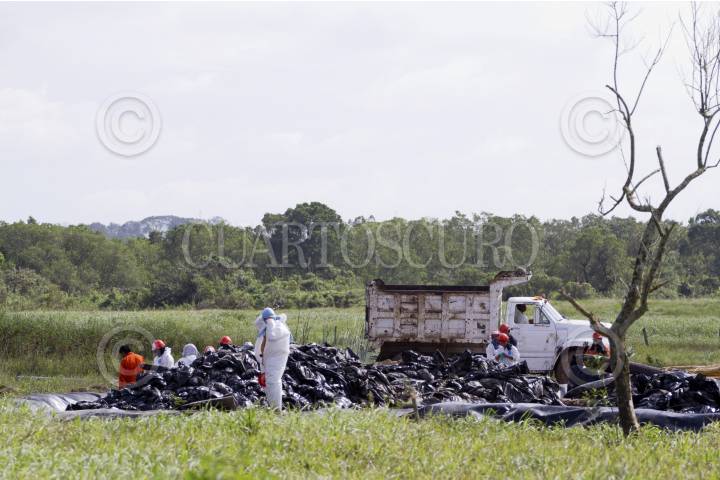 CÓSOLOACAQUE, VERACRUZ, 18ENERO2012.- Empleados subcontratados por Petróleos Mexicanos laboran a marcha forzada en las inmediaciones de la válvula de seccionamiento El Polvorín, donde al menos se han derramado ochocientos mil litros de crudo de petróleo en las aguas del río Coatzacoalcos como de igual manera en otros medios acuosos. FOTO: MARCO POLO GUZMÁ HERNÁNDEZ/CUARTOSCURO.COM