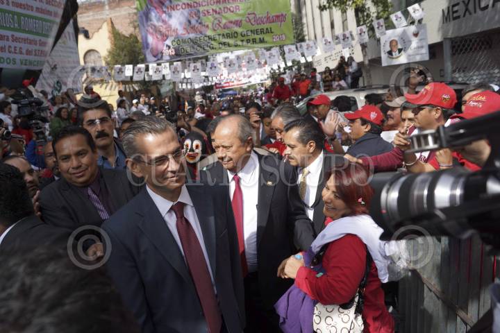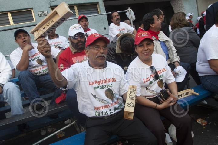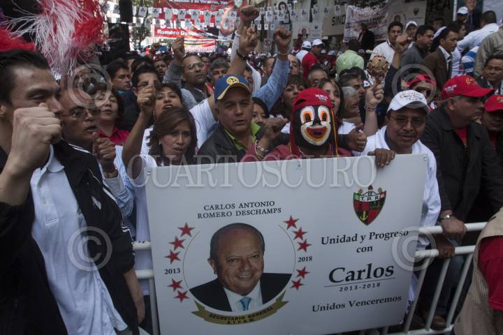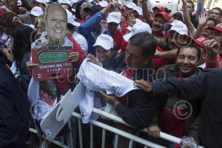MÉXICO, D.F., 20OCTUBRE2012.- Carlos Romero Deschamps, fue reelecto como secretario general del Sindicato de Trabajadores Petroleros de la República Mexicana, para el periodo 2012-2018, en la convención ordinaria de esa organización celebrada este sábado en la ciudad. A puerta cerrada, en las instalaciones de este sindicato ubicadas en la colonia Guerrero de la delegación Cuauhtémoc, los dirigentes de las 36 secciones y tres delegados adicionales por cada una de ellas votaron unánimemente a favor de la planilla del Nuevo Comité Ejecutivo Nacional, encabezada por Romero Deschamps. FOTO: IVÁN MENDEZ /CUARTOSCURO.COM