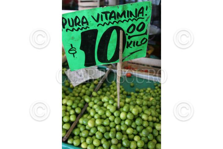 Un joven que trabaja en una frutería en el mercado Adolfo López Mateos atrae a los compradores gritando los precios de piñas, tunas, mangos y manzanas que oferta.