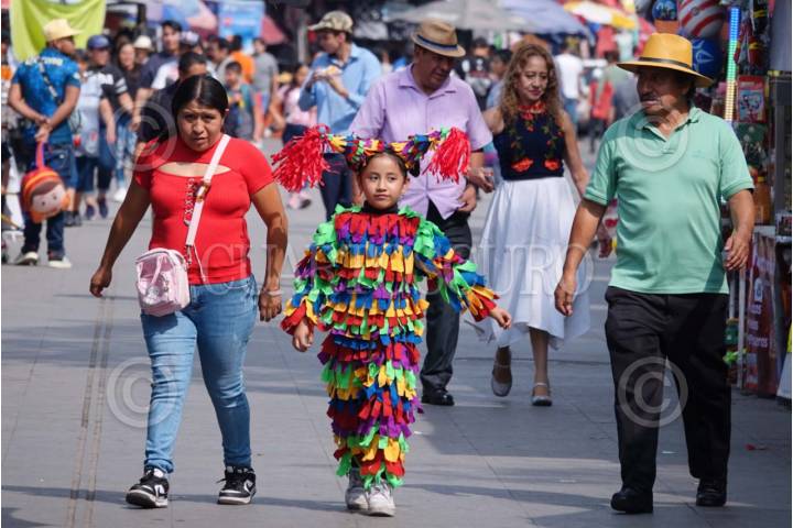 CIUDAD DE MÉXICO, 30MARZO2025.- Una niña disfrazada de piñata, acompañada de sus papás disfrutan de la tarde del domingo en la alcaldía Iztapalapa. FOTO: GRACIELA LÓPEZ/CUARTOSCURO.COM