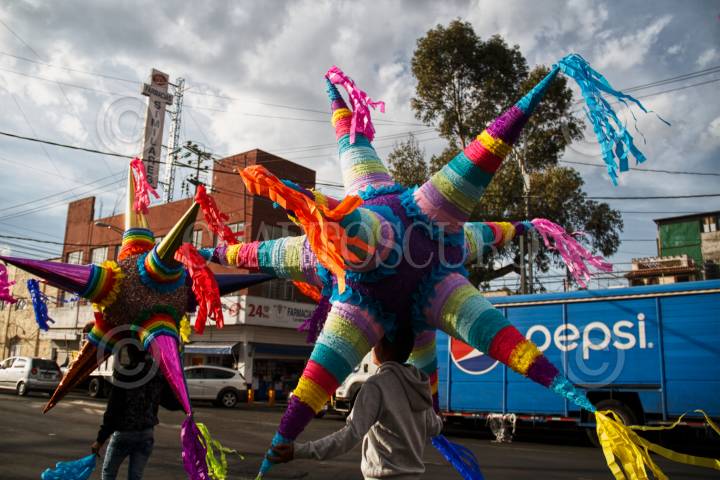 Un señor camina con varias piñatas que compró en el mercado de Jamaica.