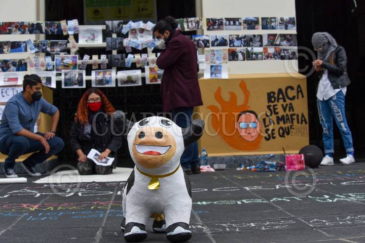 CIUDAD DE MÉXICO, 14SEPTIEMBRE2025.- Una joven rompe una piñata en forma de la Copa de Oro durante una protesta en la que colectivos y jóvenes exigieron justicia por la vivienda digna ante el fenómeno de la Gentrificación, mercantilización y desalojo de familias en diferentes predios de la capital. El acto se realizó frente al Hemiciclo a Juárez. FOTO: GRACIELA LÓPEZ/CUARTOSCURO.COM