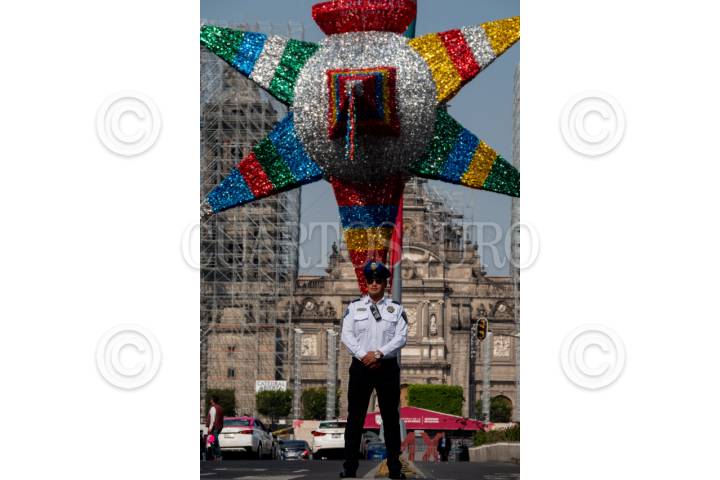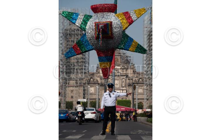 Un oficial da indicaciones viales sobre avenida 20 de noviembre, a su espalda se observa la piñata alusiva a las fiestas decembrinas.