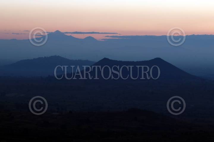 La aurora del amanecer delinea la figura del Pico de Orizaba y del Sierra Negra, al frente el volcan Tecajete.