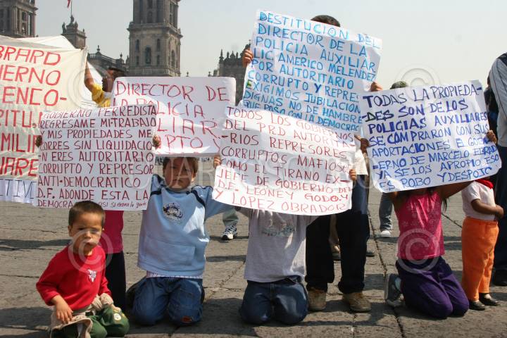 MÉXICO, D.F., 29MAYO2009.- Integrantes y familiares de el movimiento por la dignidad y los derechos de la Policía Auxiliar, se manifestaron en la plancha del Zócalo capitalino pidiendo amento de salarios a si como una reforma para esta corporación policíaca, este grupo amenazo con huelga de hambre si no se cumplen sus peticiones. FOTO: RICARDO CASTELAN/CUARTOSCURO.COM