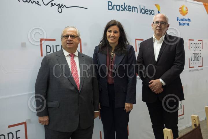CIUDAD DE MÉXICO, 26JUNIO2019.- Cleantho Leite, director de Relaciones Institucionales de Braskem Idesa; Alicia Lebrija, presidenta Fundación Televisa, y Antonio Saborit, director del Museo de Antropología e Historia, se tomaron una fotografía en la conferencia de la presentación de la exposición "Pierre Verger, con los pies en la Tierra", la cual reúne 188 fotografías del fotógrafo, un video introductorio y una proyección monumental con máscaras, sobre las danzas y fiestas tradicionales. Estará a partir del 27 de junio hasta el 29 de septiembre en el Museo de Antropología e Historia. FOTO: GRACIELA LÓPEZ /CUARTOSCURO.COM