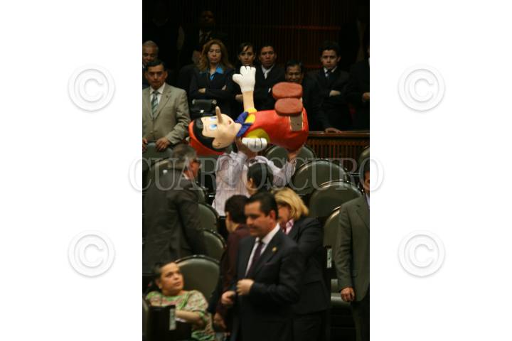 MÉXICO D.F., 09MARZO2010.- María Estela de la Fuente, Diputada del PRI, coloco una piñata con la figura de pincho equivocadamente detrás de Francisco Rojas coordinador de esta bancada y de Beatriz Paredes Rangel, presidenta nacional del PRI, ya que sería colocada en el lugar del diputado y dirigente del PAN, César Nava, esto cuando debatía sobre el convenio que se firmo entre los dirigentes del PRI y del PAN. Camilo Ramírez Puentes, Diputado del PAN, saca la piñata de pinocho del salón de plenos. FOTO: GUILLERMO PEREA/CUARTOSCURO.COM