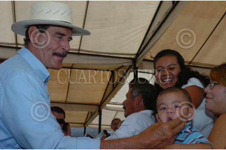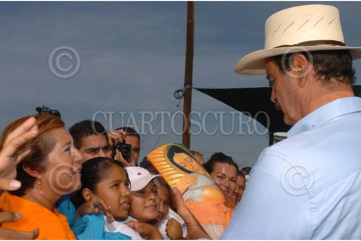 CANACHI, SINALOA 13OCTUBRE2006.- El presidente Vicente Fox Quesada observa una pintura con la figura de la virgen de Guadalupe pintada sobre una teja que le obsequio una señora de la comunidad. FOTO: GUSTAVO BENITEZ/CUARTOSCURO.COM