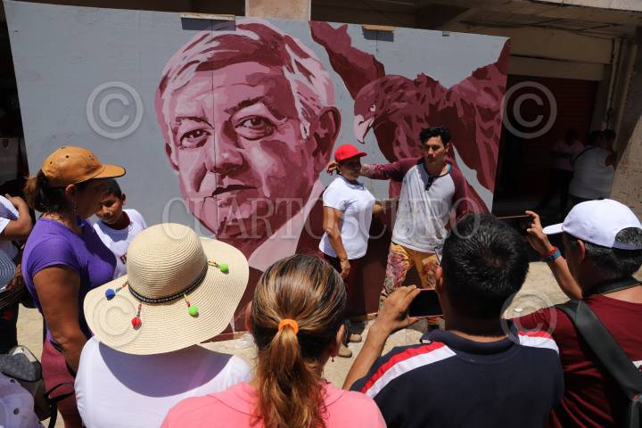 ACAPULCO, GUERRERO, 25JUNIO2018.- El artista plastico Davit de León pintó en el zócalo de acapulco la imagen de Andrés Manuel López Obrador, candidato a la presidencia de México por Morena. FOTO: BERNANDINO HERNÁNDEZ /CUARTOSCURO.COM