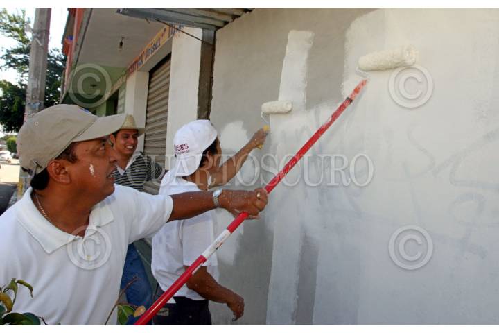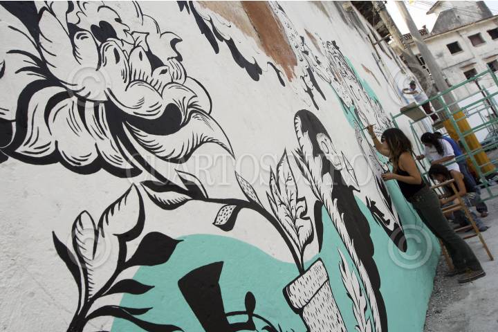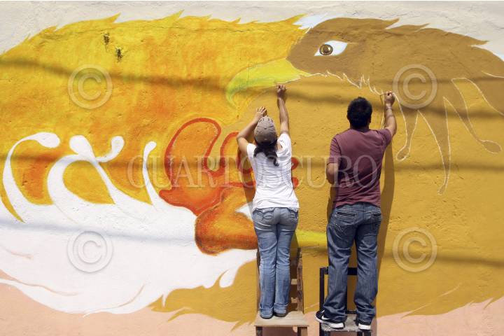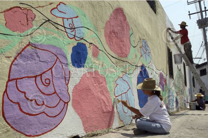 PUEBLA, PUEBLA, 12ABRIL2012.- El Colectivo Tomate, un grupo de artistas y arquitectos independientes, realizan su proyecto de pintar murales en las fachadas de las casas del barrio de Xanenetla, uno de los mas antiguos y descuidados de la ciudad con el objetivo de mejorar su imagen, involucrar a sus habitantes y convertirlo en el primer barrio-mural del país. FOTO: HILDA RÍOS /CUARTOSCURO.COM