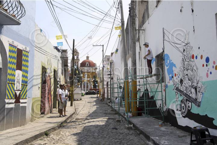 PUEBLA, PUEBLA, 13OCTUBRE2016.- El Colectivo Tomate en apoyo con la empresa Comex, realizaron recorrido por las calles de las ciudades de Puebla y Cholula en donde se realizó el pintado de murales en fachadas de casas y vecindades con el objetivo de mejorar la imagen urbana de la ciudad exaltando la identidad mexicana. FOTO: HILDA RÍOS /CUARTOSCURO.COM