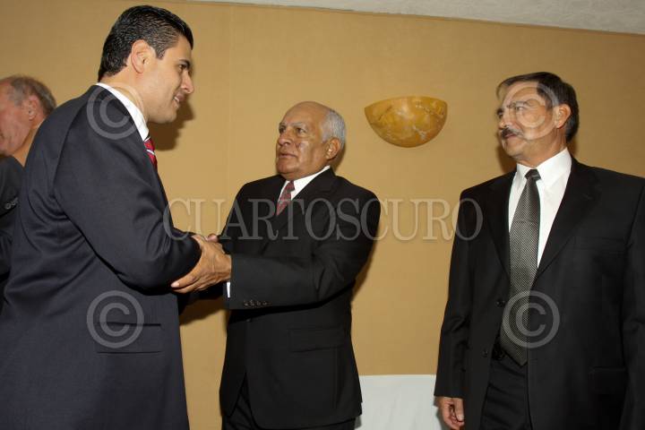 ZACATECAS, ZACATECAS, 11SEPTIEMBRE2010.- Miguel Alonso Reyes, gobernador electo de Zacatecas, saluda a los militares Jesús Álvarez Pérez y Jesús Pinto Ortiz, este último designado como Secretario de Seguridad Pública, ambos integrantes del Consejo Especial de Seguridad, esto al finalizar una conferencia de prensa en la cual el futuro gobernador presentó a su gabinete de seguridad. FOTO: MOISÉS PABLO/CUSARTOSCURO.COM