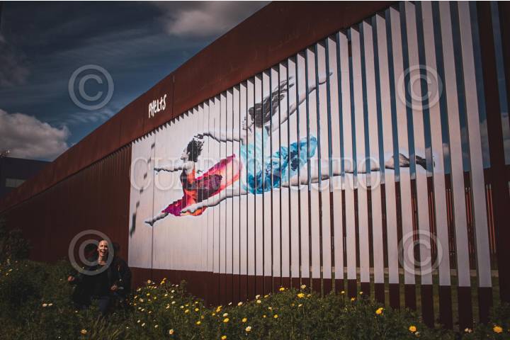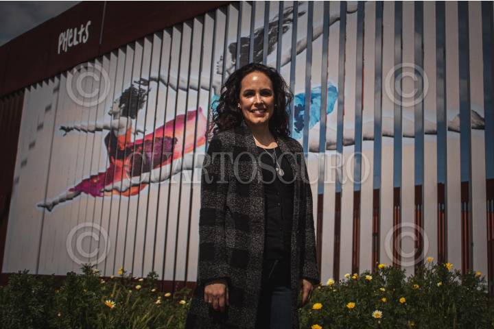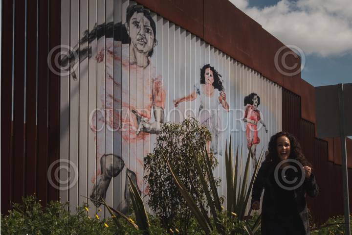La artista Alejandra Phelts simulando correr, frente al mural "Mujeres Pájaro" con la pintura "Las Amazonas", ubicado en el muro fronterizo Tijuana-San Diego, frente al Aeropuerto Internacional de Tijuana.