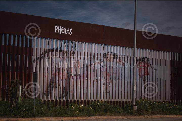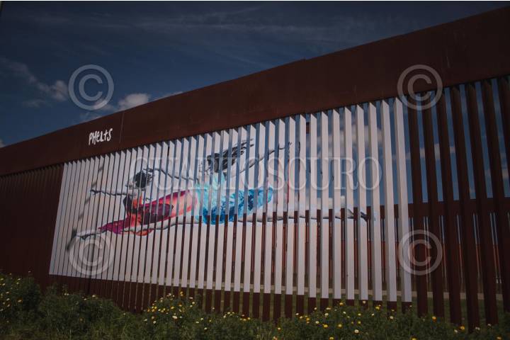 Mural Mujeres Pájaro con la pintura "Mujeres Pájaro" de la artista Alejandra Phelts, ubicado en el muro fronterizo Tijuana-San Diego, frente al Aeropuerto Internacional de Tijuana.