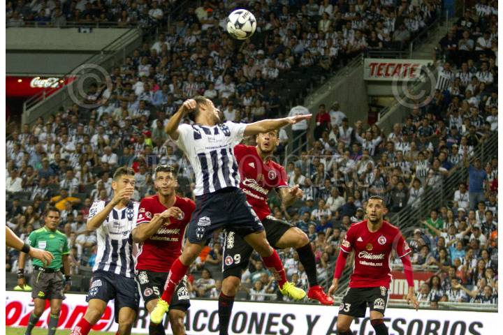 MONTERREY, NUEVO LEÓN, 10SEPTIEMBRE2016.- Jugadores del equipo de los Rayados del Monterrey intentan meter gol en un tiro de esquina ante el equipo de los Xolos de Tijuana, en el estadio BBVA Bancomer, partido correspondiente a la jornada 8 de la Liga MX. FOTO: GABRIELA PÉREZ MONTIEL /CUARTOSCURO.COM