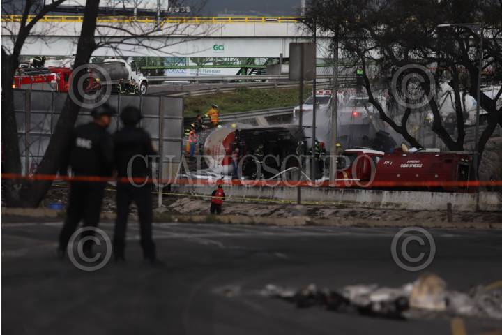 CIUDAD DE MÉXICO, 10SEPTIEMBRE2025.- Bomberos de la capital intentan enfriar la pipa de gas que se volcó está tarde en Iztapalapa. FOTO: DANIEL AUGUSTO/ CUARTOSCURO.COM