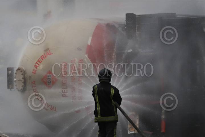 CIUDAD DE MÉXICO, 10DICIEMBRE2025.- Un bombero de la capital intenta enfriar el contenedor de la pipa de gas que se volcó la tarde de este miércoles. FOTO: DANIEL AUGUSTO/ CUARTOSCURO.COM