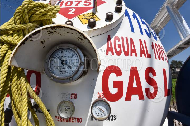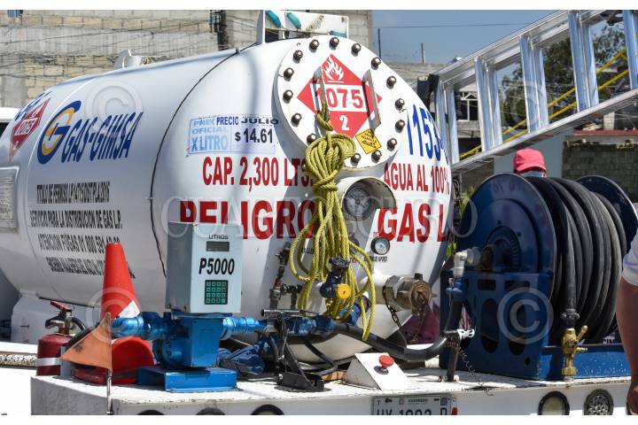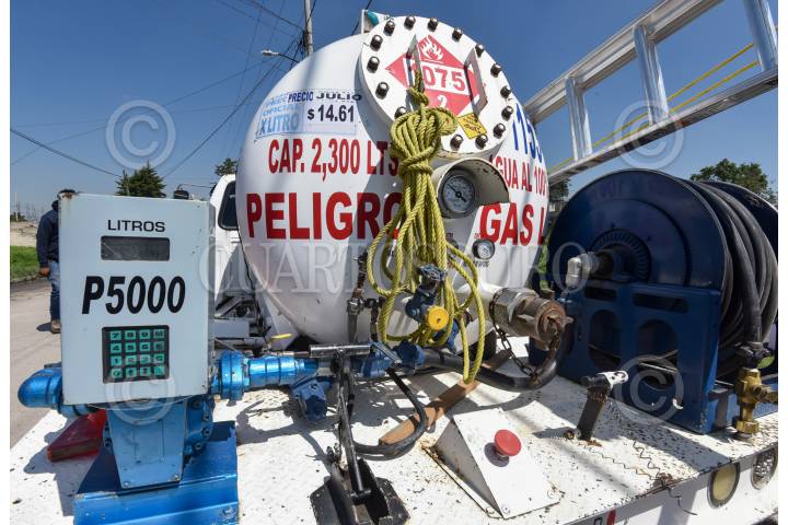 Aspectos de una pipa de gas en Toluca que muestra el precio del mes de julio en 14.61 pesos el litro.