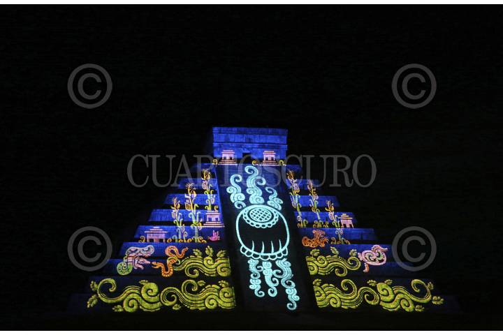 CHICHÉN ITZA, YUCATÁN, 11DICIEMBRE2014.- Aspectos del nuevo luz y sonido en la zona arqueológica de Chichén Itzá. Un total de siete proyectores de alta definición iluminan con diversos colores e imágenes en movimiento una parte de la pirámide de Kukulcán para mostrar en su superficie la historia de Chichén Itzá. FOTO: FRANCISCO BALDERAS /CUARTOSCURO.COM