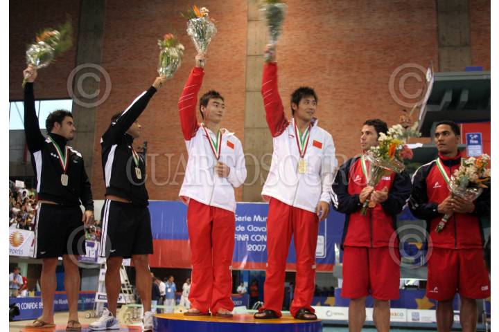 MÉXICO, D.F., 08SEPTIEMBRE2007.- Los chinos Kai Qin y Feng Wang obtuvieron el primer lugar de la prueba de trampolin de tres metros sincronizado varonil, que se realizó en el marco de la Serie Mundial de Clavados FINA-CONADE 2007 en la Alberca Olímpica, mientras que los canadienses Alexandre Despatie y Arturo Miranda obtuvieron el segundo lugar; y los cubanos Jorge Betancourt y Erik Fornaris el tercero. FOTO: ISAAC ESQUIVEL/CUARTOSCURO.COM