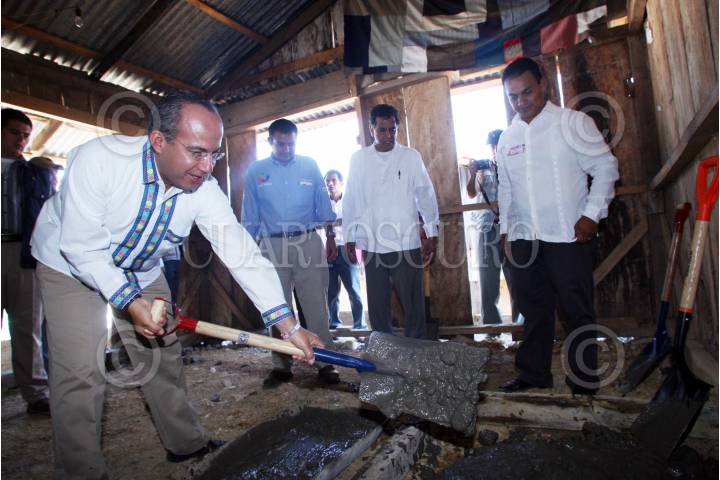 COMUNIDAD DE PLAN DE ARROYOS MUNICIPIO DE ATZALAN, VERACRUZ, 15AGOSTO2008.- Felipe Calderón Hinojosa, Presidente de México, acompañado con Fidel Herrera, gobernador de la entidad y Ernesto Cordero, Secretario de Desarrollo Social, realizó las primeras paladas con cemento en el marco del programa gubernamental "Pisos Firmes". FOTO: ALFREDO GUERRERO/CUARTOSCURO.COM
