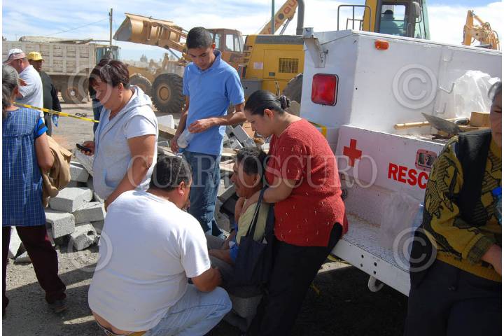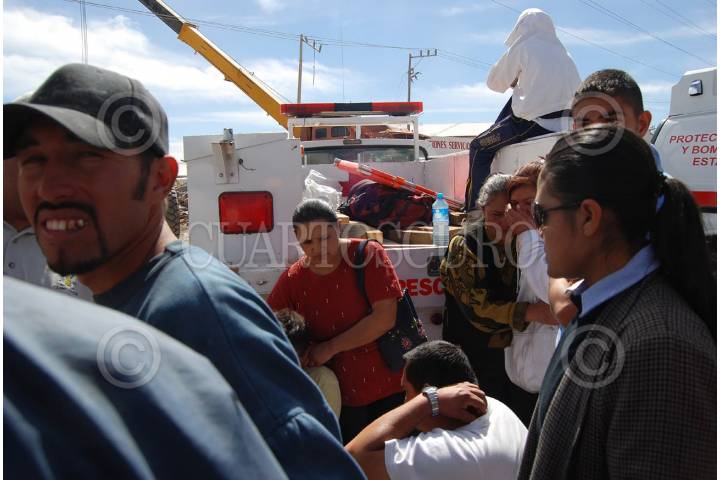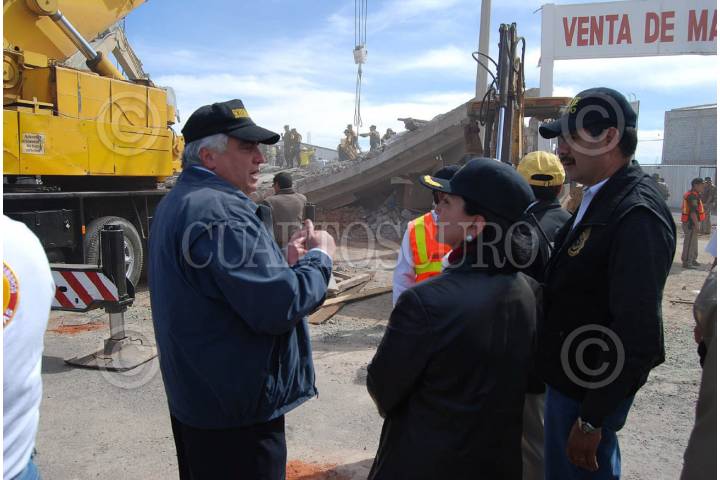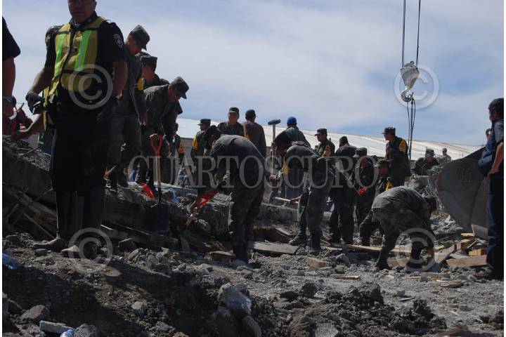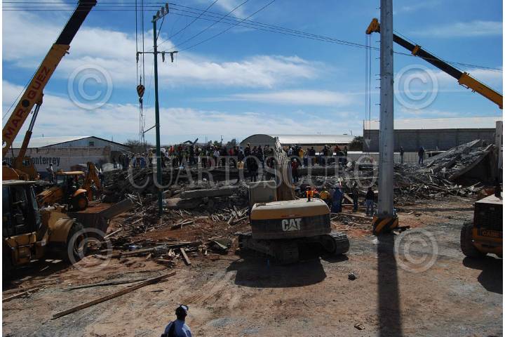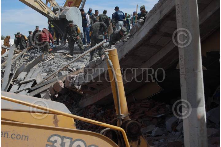 GUADALUPE, ZACATECAS, 06FEBRERO2009.- Aproximadamente a las 11 de la mañana se derrumbó un edificio de tres pisos que estaba en construcción en el libramiento Transito Pesado carretera 45 México-Ciudad Juárez frente al edificio de el periodico la Jornada Zacatecas. Al lugar acudieron elementos del bomberos y protección civil, así como elementos de la policía estatal y el ejercito mexicano. Amalia Garcia, Gobernadora del Estado, acudió al lugar de los hechos para coordinar las labores de rescate en coordinación con las corporaciones. Hasta el momento se han recatados a 2 personas lesionadas, 2 muertos y siguen las acciones para rescatar a mas trabajadores que se encontraban laborando cuando sucedió el lamentable percance. FOTO: CARLOS SEGURA/CUARTOSCURO.COM