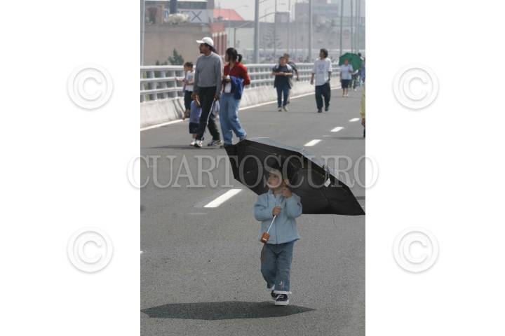 México, D.F., 22AGOSTO2004.- Un niño se cubre del intenso sol al dar un paseo por las recien inauguradas obras de los segundos pisos del Periférico, en el tramo Benvenuto Cellini-Las Flores. FOTO: Moisés Pablo/CUARTOSCURO.COM