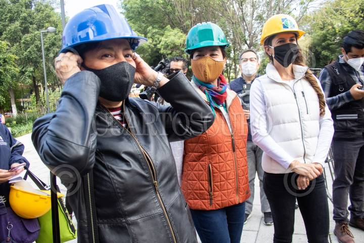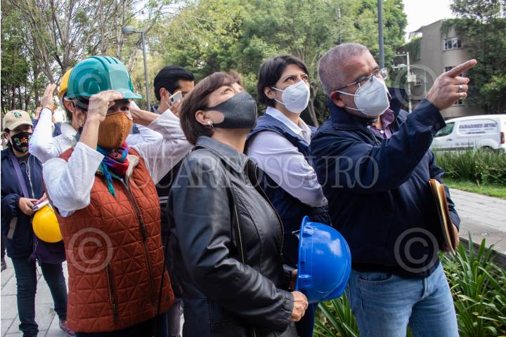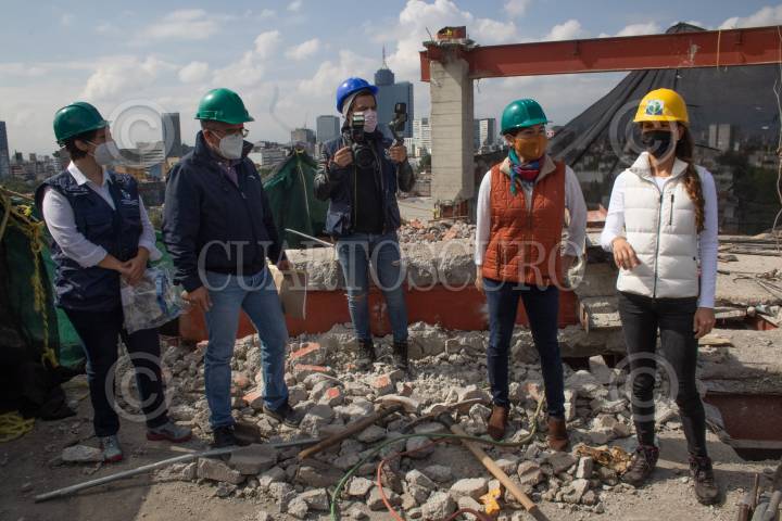 Ileana Villalobos Estrada, Marina Robles García, y Mariana Boy, durante la supervisión del inicio de demolición en el edificio de Baja California 370.