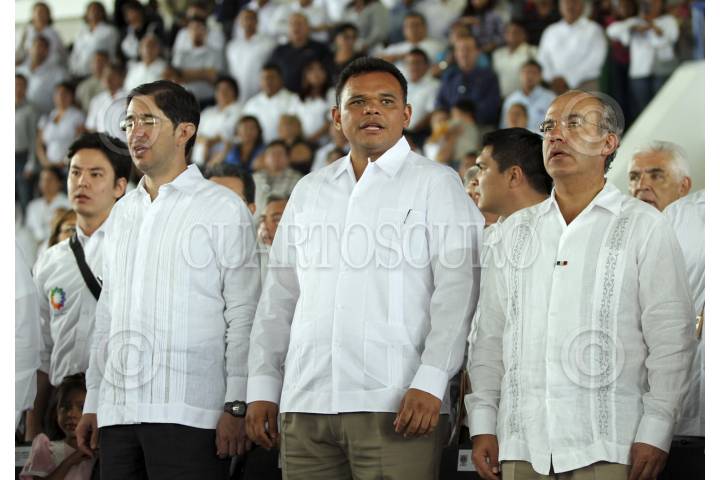 MÉRIDA YUCATÁN, 24NOVIEMBRE2012.- Rolando Zapata Bello, gobernador del estado, Felipe Calderón Hinojosa, Presidente de México, y Heriberto Félix Guerra, secretario de Desarrollo Social, entregaron el certificado de tres millones de pisos de cemento en el país, la ceremonia protocolaria en el gimnasio polifuncional de la colonia San José Tecoh al sur de la ciudad. FOTO: FRANCISCO BALDERAS /CUARTOSCURO.COM